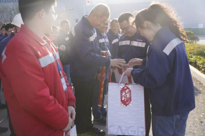 上午9點(diǎn),中偉銅仁(上市主體)產(chǎn)業(yè)基地總經(jīng)理趙能華走進(jìn)基地各部門工作場地,為兩千多名正投入新春第一天工作中的員工送上開工紅包,寓意新年“開門紅”,并祝愿大家龍年大吉、宏圖大展。