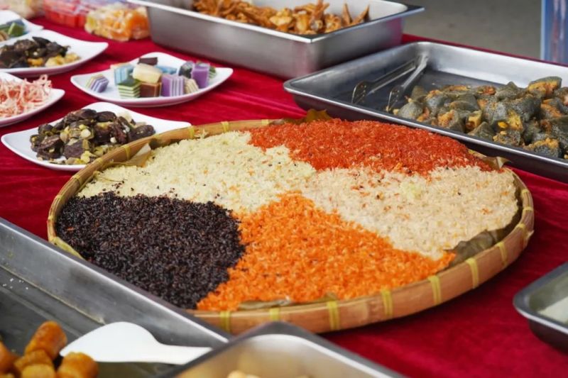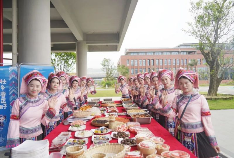 伴隨著此起彼伏、高遏行云的歌聲,另一邊的長桌美食盛宴也拉開帷幕,有象征吉祥如意、五谷豐登的五色糯米飯;有清香四溢、滿口香甜的各色水果;有清甜軟糯、蘊(yùn)含著壯族人民對美好生活向往的粽子;還有各式各樣、滿口留香的面點......食材豐富,色香味俱佳,把壯鄉(xiāng)民俗特色展現(xiàn)得淋漓盡致。