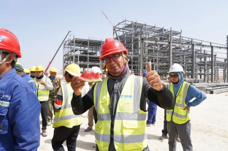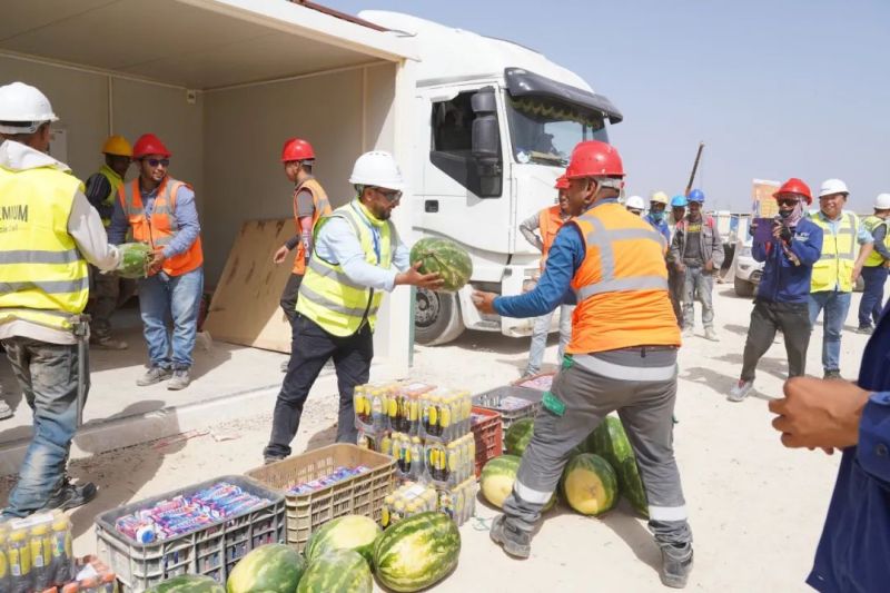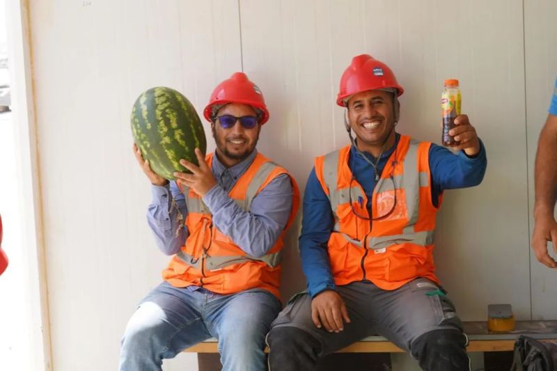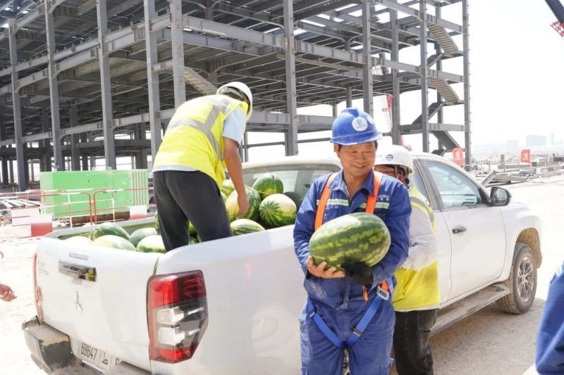 盡管高溫炙烤,項(xiàng)目現(xiàn)場的工人們?nèi)詧允匾痪€、不畏酷暑、辛勤工作,確保工程建設(shè)的順利進(jìn)行。此次,摩洛哥項(xiàng)目組為施工人員準(zhǔn)備了500瓶酸奶、500瓶涼茶、2000斤西瓜等防暑降溫物品,按各單位人數(shù)送至施工現(xiàn)場分配發(fā)放。