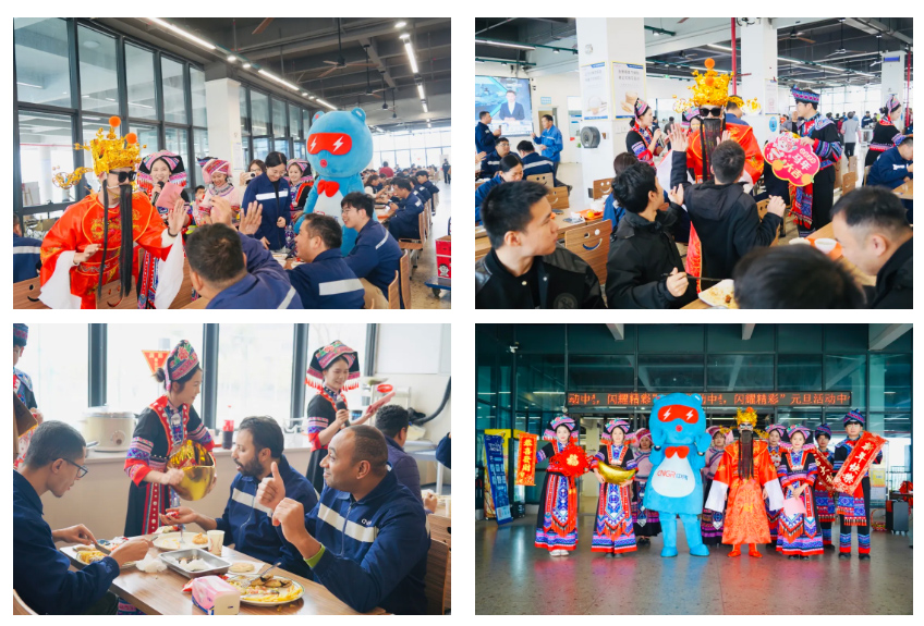 基地形象大使團(tuán)也迎來了“驚艷首秀”。他們與活潑可愛的“鋰電寶寶”、喜氣洋洋的“財(cái)神爺”共同集結(jié),組成了一支活力滿滿的送福小分隊(duì)。在濃厚的節(jié)日氛圍中,這支“福氣天團(tuán)”通過創(chuàng)意十足的互動(dòng)與沉浸式文化體驗(yàn),正式拉開了基地辭舊迎新、共赴新篇的華麗序幕?!盎?dòng)體驗(yàn)巡游”環(huán)節(jié)點(diǎn)燃了全場(chǎng)最高熱情。員工們爭(zhēng)相與“財(cái)神爺”大力擊掌、擁抱“金元寶”,在響亮的掌聲中“掌”握新年好彩頭?!敖痈L魬?zhàn)”更是一場(chǎng)智慧與默契的較量,大家妙語連珠,接力送出“一馬當(dāng)先”的節(jié)日祝福。摩洛哥同事也深受感染,熱情加入其中,中外伙伴歡聚一堂,在歡聲笑語間繪就了一幅跨越國(guó)界的文化交融新春圖景。