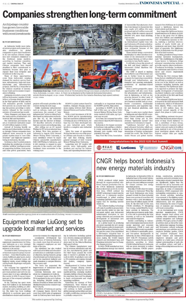 作為國家英文日報(bào),中國日報(bào)(China Daily)在11月15日當(dāng)天發(fā)行的G20特刊中,聚焦中偉在印尼的產(chǎn)業(yè)發(fā)展,用四分之一版面大幅刊登題為《CNGR helps boost Indonesia's new energy materials industry》(中偉助力印尼新能源材料產(chǎn)業(yè)發(fā)展)的重點(diǎn)報(bào)道。